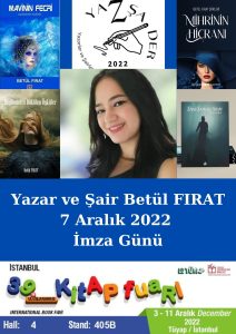 Yazar ve şair Betül Fırat, TUYAP’in İstanbul’da düzenlediği 39. Uluslararası Kitap Fuarı’nda okuyucularıyla buluşuyor.