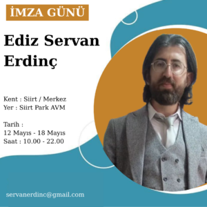 Siirt Park AVM’de imza gününde, Ediz Servan Erdinç hem kitaplarını imzalayacak hem de okurların yazarlık ve edebiyat üzerine sorularını cevaplayacak. Edebiyatseverlerin edebiyata olan ilgisini artırmayı ve yazarlık mesleğini tanıtmayı, sevdirmeyi amaçladığını söyleyen Ediz Servan Erdinç, Siirt’te yaşayan ve yolu Siirt’ten geçecek olan herkesi Siirt Kitap Fuarı – İmza Günü etkinliğine davet etmektedir.
